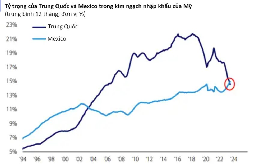 Lần đầu tiên kể từ năm 2003, Mỹ đang nhập khẩu hàng hóa từ Mexico nhiều hơn Trung Quốc, theo số liệu từ ngân hàng Bank of America.